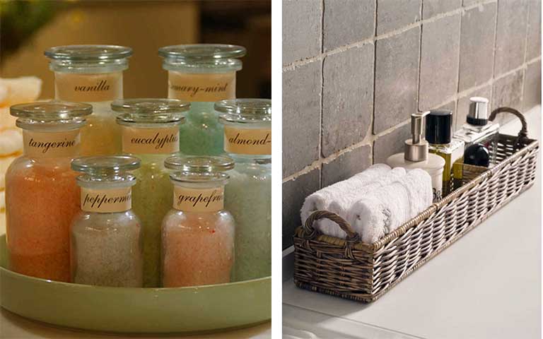 Пробајте да организирате купки, гелови за туширање и шампони во украсни, плетени корпички, и да речеме ги ставите на купатилскиот ормар, кај прозорот или слично место, а покрај нив ке ги ставите пешкирите за раце и лице смотани во мали ролнички. Покрај овакви корпи одговараат на пример стаклени теглички кои ке ги наполните со тупфери, сол за капење и слично. Кога е сол за капење во прашање пробајте и сами да го направите. На интернет можат да се најдат проверени и едноставни рецепти за најприродни купки, соли и препарати.